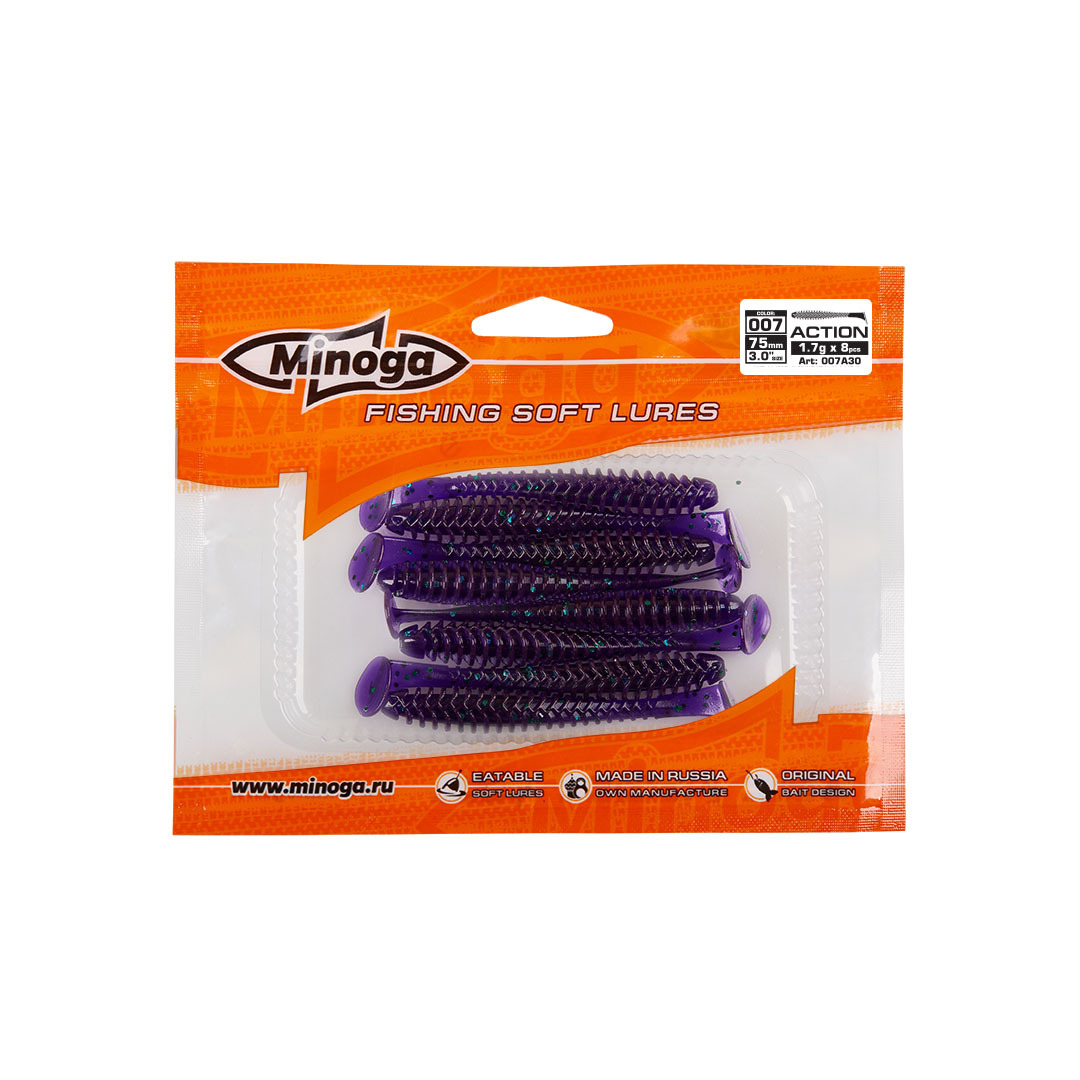 Виброхвост Minoga ACTION имеет удлиненное ребристое тело, которое создает шумы в водной среде, заставляя тем самым, обратить на себя внимание любому, даже самого пассивному хищнику. Приманка работает даже при самой медленной проводке! Action делается, как и все приманки MINOGA из мягкого съедобного силикона, с содержанием как вкусовой, так и ароматической добавки. Основным объектом ловли на данную приманку является окунь, судак и щука.  Эту приманку можно использовать на всех типах джиговых монтажей такие как: Джиг-головка, Шарнирный монтаж с разборной чебурашкой, Поводковые оснастки, Джиг-риг, Дроп-шот итд.