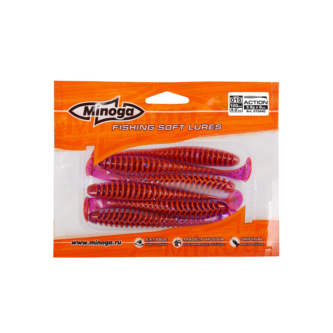 Виброхвост Minoga ACTION имеет удлиненное ребристое тело, которое создает шумы в водной среде, заставляя тем самым, обратить на себя внимание любому, даже самого пассивному хищнику. Приманка работает даже при самой медленной проводке! Action делается, как и все приманки MINOGA из мягкого съедобного силикона, с содержанием как вкусовой, так и ароматической добавки. Основным объектом ловли на данную приманку является окунь, судак и щука.  Эту приманку можно использовать на всех типах джиговых монтажей такие как: Джиг-головка, Шарнирный монтаж с разборной чебурашкой, Поводковые оснастки, Джиг-риг, Дроп-шот итд.