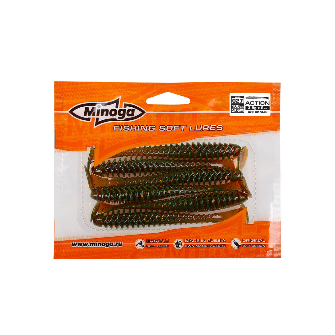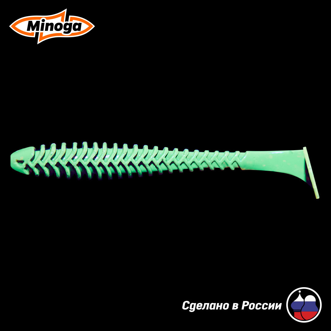 Виброхвост Minoga ACTION имеет удлиненное ребристое тело, которое создает шумы в водной среде, заставляя тем самым, обратить на себя внимание любому, даже самого пассивному хищнику. Приманка работает даже при самой медленной проводке! Action делается, как и все приманки MINOGA из мягкого съедобного силикона, с содержанием как вкусовой, так и ароматической добавки. Основным объектом ловли на данную приманку является окунь, судак и щука.  Эту приманку можно использовать на всех типах джиговых монтажей такие как: Джиг-головка, Шарнирный монтаж с разборной чебурашкой, Поводковые оснастки, Джиг-риг, Дроп-шот итд.