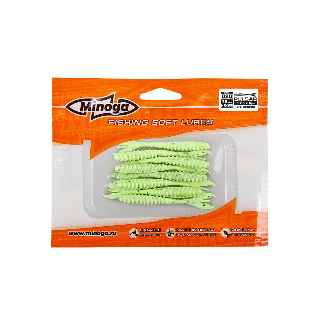 Слаг Minoga PULSAR имеет тело довольно объемное, ребристое плавно переходит в гибкий и крайне подвижный хвост, заставляя тем самым, обратить на себя внимание любого, даже самого пассивному хищника! Pulsar делается, как и все приманки MINOGA из мягкого съедобного силикона, с содержанием как вкусовой, так и ароматической добавки. Основным объектом ловли на данную приманку является окунь, судак и щука.